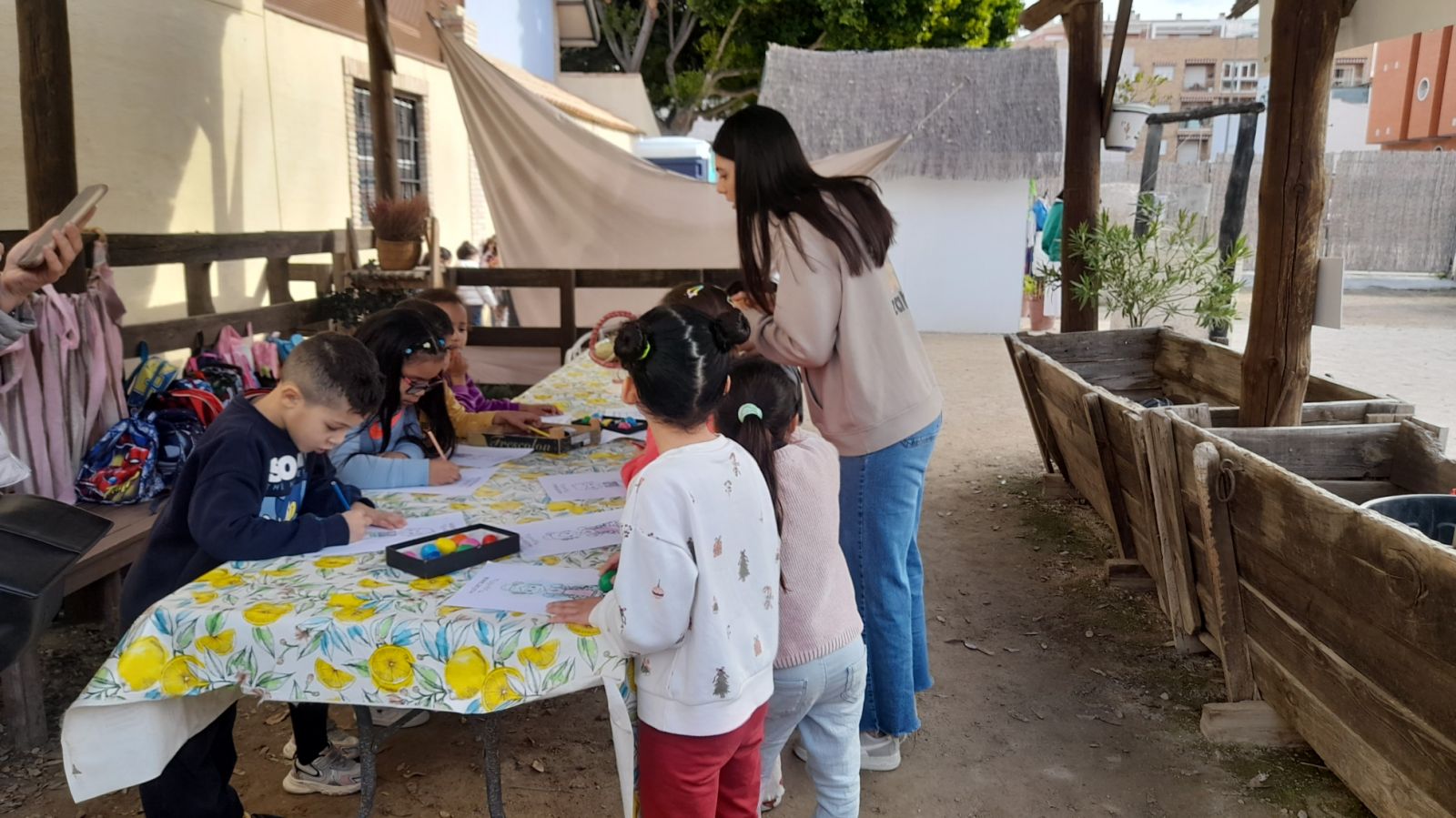 Incluso han conocido algunas de las herramientas típicas de la huerta, han aprendido las distintas partes del traje regional. Finalizando, la actividad con la práctica de algunos de los juegos tradicionales huertanos, como los bolos, la petanca, el caliche… y un pequeño taller de pintura (dibujo de un/a huertano/a).